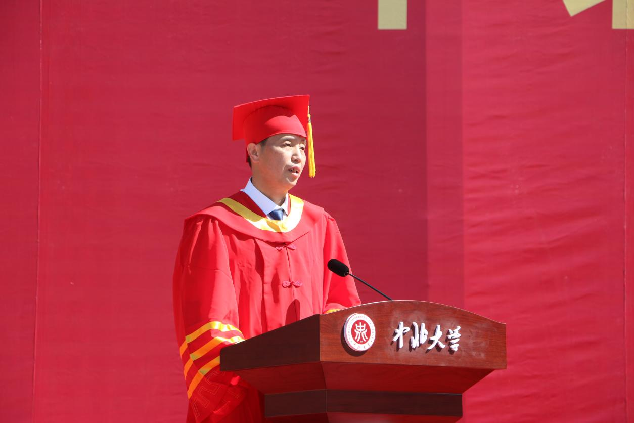 熊继军校长在讲话中首先代表学校向顺利完成学业的同学们表示热烈祝贺,向辛勤培育同学们的父母和老师致以衷心的感谢。熊校长指出,四年很长,我们用时间见证了疫情下人与人之间的守望相助、彼此温暖;见证了抗议一线不惧艰险、挺身而出的最美“逆行者”;见证了举办北京冬奥会的中国能力、中国实力与中国魅力;也更加见证了以人民为中心的执政理念在全球抗疫中彰显出的中国速度、中国力度与中国温度;见证了中北大学在办学育人征程上的踔厉奋发。四年很短。曾经习以为常去教室上课、食堂打饭、实验室加班的三点一线生活一去不复返了;儿时的梦想正变成为人生职业。