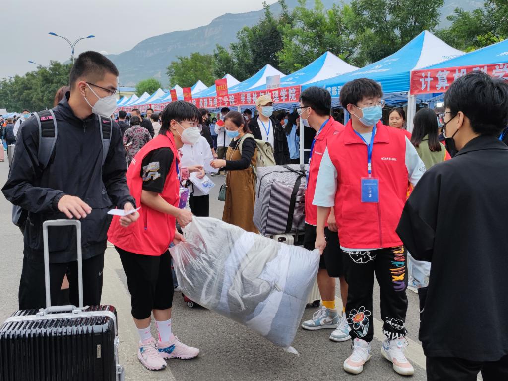 身着红色马甲的迎新志愿者,来回穿梭在校园中和迎新报到现场,为新生们引路答疑、搬运行李,为这陌生的校园填满了爱心的色彩。