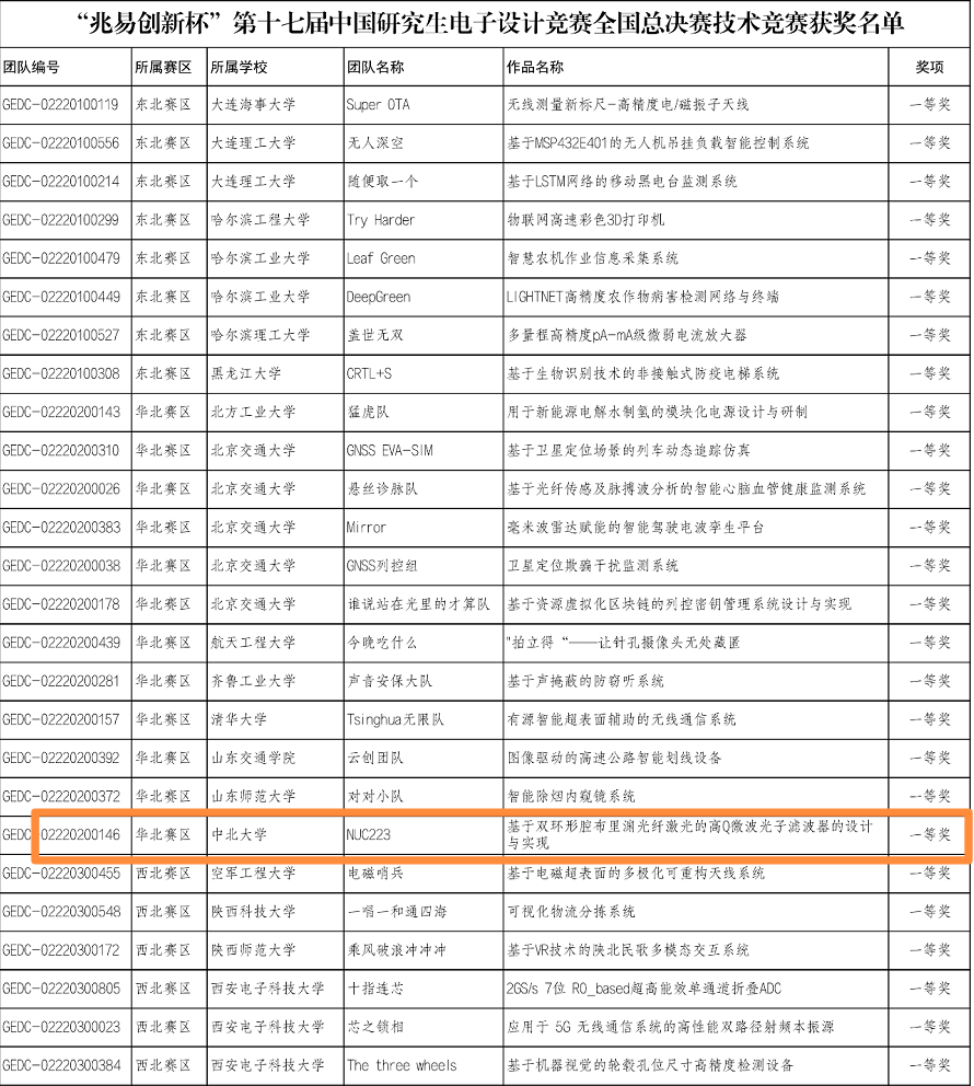 2022年9月25日,“兆易创新杯”第十七届中国研究生电子设计竞赛全国总决赛获奖名单公布。由我校教师刘毅副教授作为指导教师,2020级研究生王琳毅、2021级研究生韩学锋参赛的“NUC223”参赛队,以“基于双环形腔布里渊光纤激光的高Q微波光子滤波器的设计与实现”为作品名称,历经初赛、复赛和全国总决赛紧张激烈的层层比拼,从5824支参赛队伍中脱颖而出,荣获全国总决赛技术竞赛全国一等奖。也是我校研究生在中国研究生电子设计竞赛中首次获得全国一等奖!