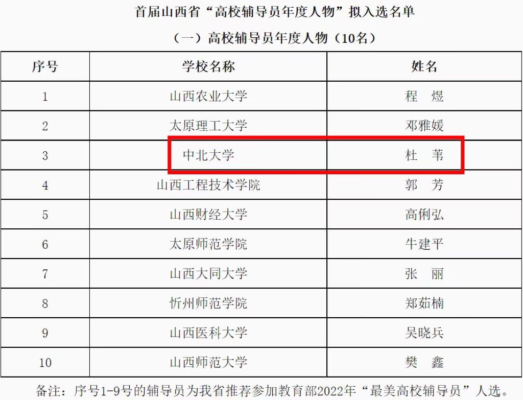 我校经各学院推荐申报、校内评审,择优推荐电气与控制工程学院辅导员杜苇参加省级评审。经省教育工委、省教育厅组织专家评审,杜苇当选首届山西省“高校辅导员年度人物”,并被推荐参加教育部2022年“最美高校辅导员”评选。