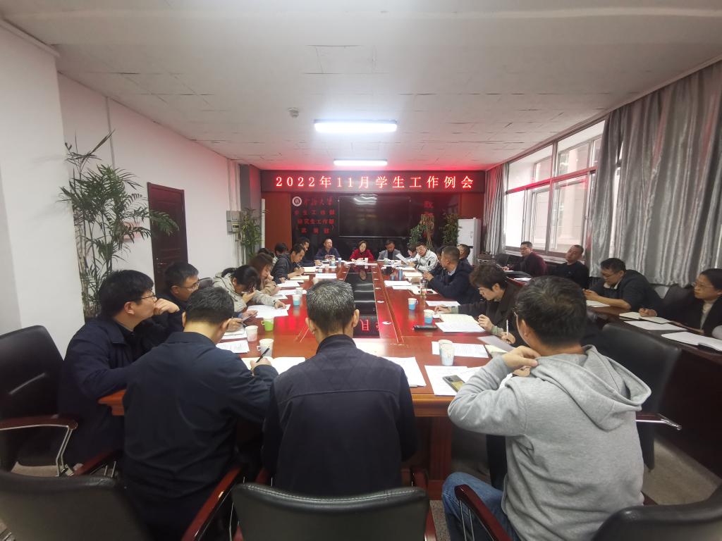 2022年11月2日下午,我校在德怀楼211会议室召开11月份学生工作例会,安排部署11月份工作,校党委副书记雷锋斌出席会议,学生工作部负责人及各学院党委副书记参加会议,学生工作部部长李俊华主持会议。