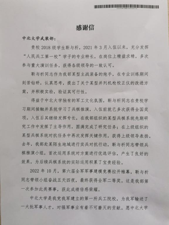 信中提到:我校2018级学生靳与析,2021年3月入伍后,利用在校学到的专业知识,以及在校参加兵棋推演大赛和教官大队训练中培养的军事素养,在部队武器装备创新研发、兵棋系统对抗应用中发挥了重要作用,带队参加第六届全军军事建模竞赛荣获全军二等奖。