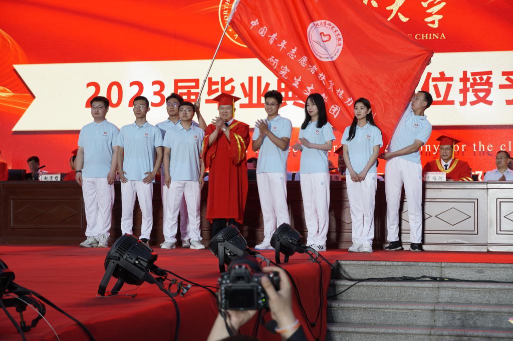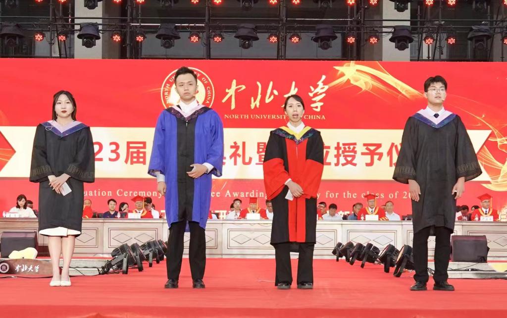 校党委副书记曾建潮教授宣读《中北大学关于表彰2023届优秀毕业生的决定》,副校长赵贵哲教授宣读《中北大学关于拟授予2022届毕业生学位的决定》,大会举行了隆重优秀毕业生颁奖仪式、学位授予仪式和研究生支教团授旗仪式。主席台领导和嘉宾为2023届优秀毕业生代表颁奖;校党委书记沈兴全教授为博士毕业生代表正冠拨苏、颁发学位证书并合影留念,全体校领导为硕士、本科毕业生代表正冠拨苏、颁发学位证书并合影留念;校党委书记沈兴全为研究生支教团授旗。天涯有尽处、师恩无穷期,典礼上,毕业生代表们分别向学校教育教学一线的教师、辅导员以及后勤、校医院、保卫处等服务保障部门的教职员工献花致敬,并现场号召现场所有同学向辛勤付出的全体教职员工鞠躬致谢。
