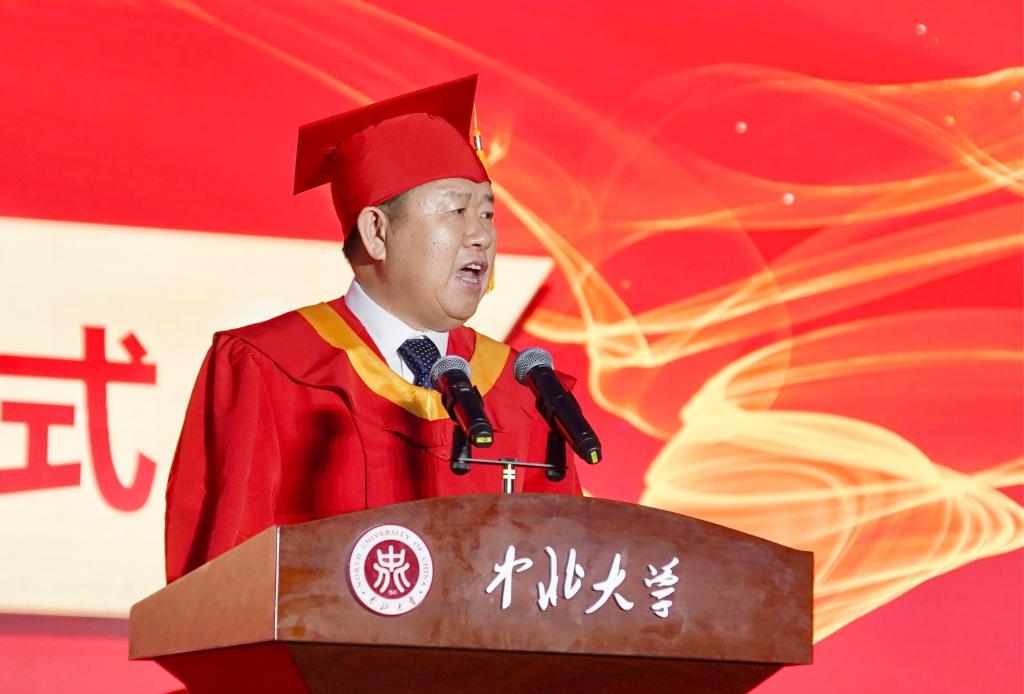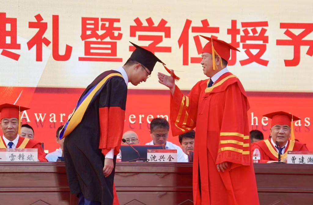 时光之河,奔流入海。典礼最后,校党委书记沈兴全作《做一朵奔涌的“浪花” 在新时代乘风破浪》主题致辞,代表熊继军校长和全校教师,为毕业生们带来大学的“最后一课”。我们“一起经历‘时代之变’,在不确定中坚持确定性发展;一起回答“时代之问”,争做堪当大任的时代青年;与学校一起担当“时代之责”,交上属于我们的强国答卷。”沈兴全书记细数近年来学校各项事业整体高质量发展的良好态势,他希望毕业生们展现出逢山开路、遇水搭桥的智慧和勇气,争做堪当大任的时代青年。千叮万嘱长者心。面对即将远行的青葱学子,沈兴全发出谆谆叮咛,深情寄语毕业生们,希望同学们做一朵随潮澎湃的“浪花”,主动适应社会;用海纳百川的胸襟和豁达宽容的气度去适应变化的社会,在面对逆境时要独立思考、强大自己。希望同学们做一朵勇立潮头的“浪花”,积极融入社会;投身发展洪流,与时代同步伐、与人民共命运,主动把小我融入祖国的大我、人民的大我,在这个大有可为、大有作为的时代脚踏实地、勇毅前行。希望同学们做一朵大爱润泽的“浪花”,甘于奉献社会;以奉献为荣、以奉献为美,用爱去回报爱、用真心换真情,在服务他人、奉献社会中收获成长和进步,找到青春方向和人生目标。他指出,我们每个人都是时代的浪花,身处时代的汪洋,“时间会回答成长,成长会回答梦想,梦想会回答生活,生活会回答你我的模样。”让我们一起跃入人海,做一朵奔涌的“浪花”,在新时代乘风破浪!