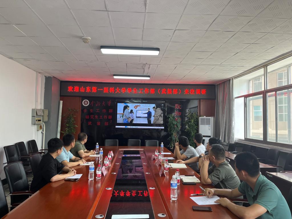 7月6日上午,山东第一医科大学学生工作部(武装部)一行三人,在学生工作部(武装部) 王玉鹏副部长带领下,来我校就学生军训、国防教育和兵棋推演等工作进行调研,调研组成员包括学生工作部(武装部)国防教育科科长安文、医学信息工程学院辅导员宋泽楷。我校学生工作部(研究生工作部、武装部)崔亚副部长、机电工程学院党委刘光副书记以及军事训练科、国防教育科相关老师和部分辅导员参加调研。调研组首先参观了我校教育部“大思政课”实践教学基地兵器装备陈列室,随后参观了兵棋推演竞赛场所、实地观摩了兵棋推演对抗赛,最后双方在学生工作部会议室进行座谈交流。崔亚副部长为客人介绍了学校的基本情况,现场播放了学校宣传片,并详细介绍了学校国防教育和学生军训开展的情况、特色做法等。双方还就《军事理论》课程建设、国防教育活动开展等进行了深入探讨。