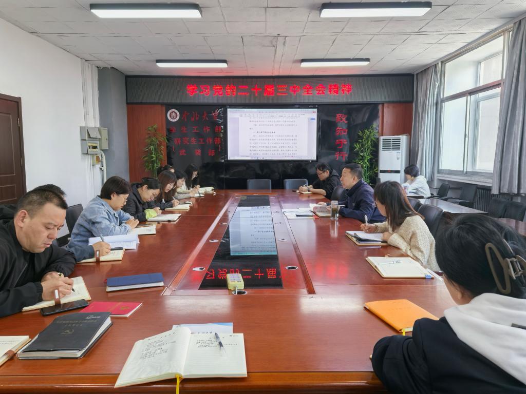 10月8日,学生工作部(研究生工作部、武装部)党支部召开专题学习会,重点学习党的二十届三中全会及全国教育大会重要精神,学生工作部(研究生工作部、武装部)党支部全体党员参加,会议由学生工作部(研究生工作部、武装部)党支部书记顾宁主持。