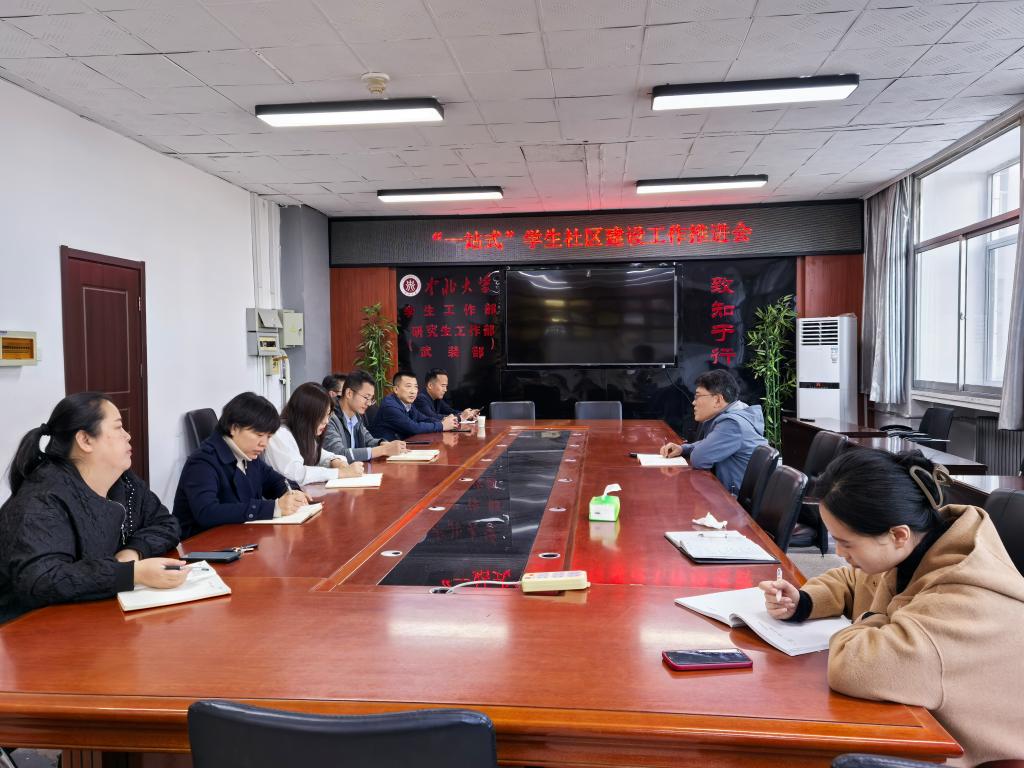 10月11日上午,根据学校“一站式”学生社区综合管理模式建设领导小组工作会议要求,学生工作部在德怀楼211会议室召开“一站式”学生社区工作推进会。学生工作部副部长崔亚、后勤管理部副部长陈建富、相关学院负责人参加会议。会议由崔亚主持。