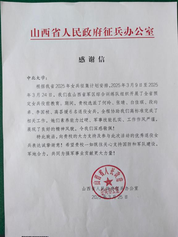 近日,我校收到山西省人民政府征兵办公室发来的感谢信,高度赞扬我校选派的6名优秀学生在全省预定女兵役前教育工作中作出的突出贡献。