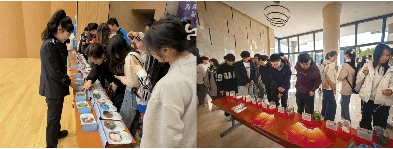 宣誓结束后,“走进模型,巩固认知” 现场观摩环节随即展开。学生们有序前往仿真毒品模型展示区,近距离观察宣讲团带来的各类毒品仿真模型。从外观酷似 “巧克力”的合成毒品,到包装与普通饮料无异的 “伪装毒品”,直观的展示让学生们对毒品的 “伪装术” 有了更具象、更深刻的认知,进一步强化了“见微知著” 的防范意识,为日常防毒拒毒筑牢“视觉防线”。