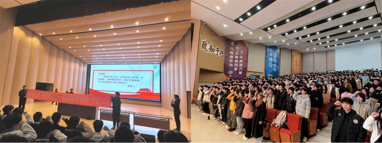随后进入 “青春誓言,拒毒有我” 庄严宣誓环节。在宣讲团警官的带领下,全体参与学生高举右拳,以洪亮而坚定的声音许下承诺:“我是中华儿女,以生命名义承诺,从我做起,远离毒品诱惑,捍卫无毒青春,为中华民族伟大复兴而奋斗!” 铿锵的誓言回荡在活动现场,不仅是学生们对自身的约束,更凝聚起共同守护校园净土的决心。