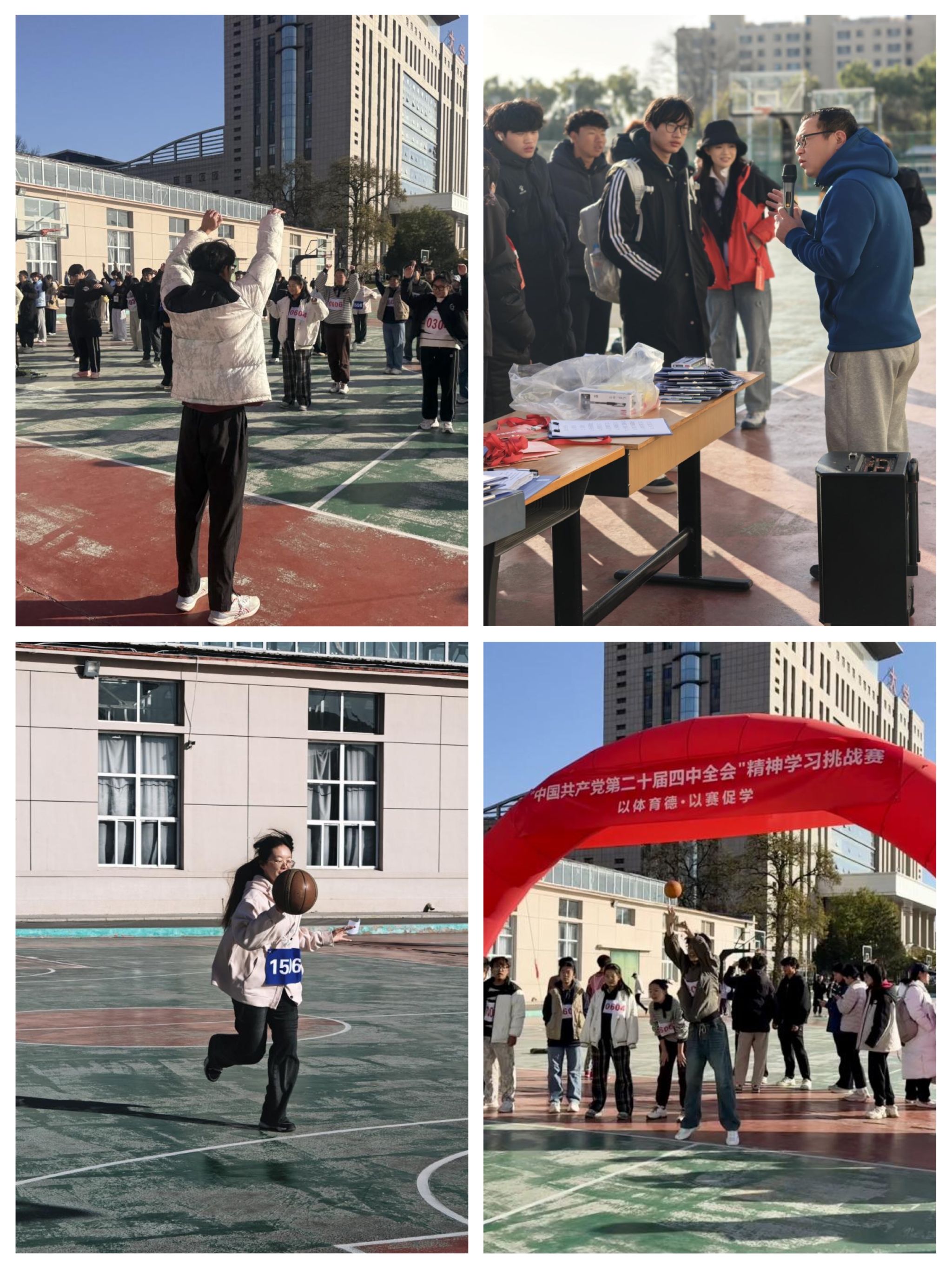 在前期各学院组织理论测试初赛的基础上,各代表队晋级参加本次挑战赛。活动设置了三大特色赛事项目,实现理论学习与体育运动的有效融合:“理论学习接力赛”考验队员的运球速度与答题效率;“精准投掷问答”融合投掷技巧与知识储备;“校园十全十美积分挑战赛”则注重团队协作,考验学生在合作中快速掌握党的二十届四中全会精神知识点。比赛中,各代表队严格遵守规则,在运球接力中配合默契,在投掷答题中沉着应对,在校园寻宝环节高效分工。现场加油声、喝彩声此起彼伏,氛围热烈而有序。