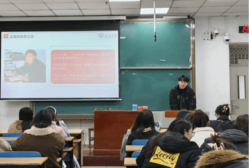 随后,周祥同学围绕《习近平在正定》,解读初心在地方治理中的实践启航。他详细介绍了习近平同志在正定主政期间的改革担当:突破思维定势推出“人才九条”,立足县情布局“半城郊型经济”,骑着自行车走遍全县调研,以坚定决心刹住不正之风,充分展现了年轻县委书记的战略眼光与为民情怀。