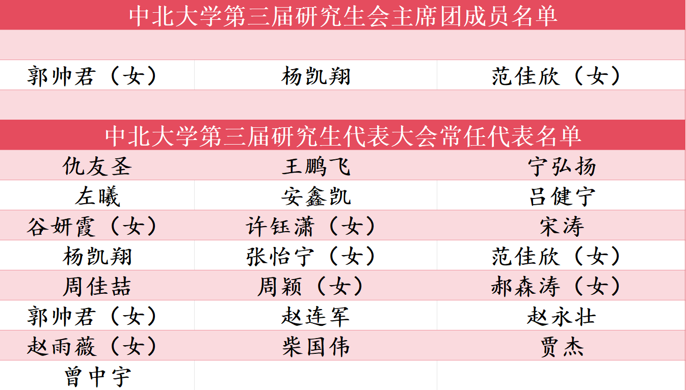 中北大学第三次研究生代表大会的召开,是我校研究生工作承前启后、继往开来的重要节点。在新的征程中,校研究生会及各常任代表必将继续与广大师生一道,不忘初心,牢记使命,与祖国共成长,与人民同奋进,与学校共前行,助力中北大学奋进双一流,将美好青春绽放在中华民族伟大复兴的壮阔征途中。