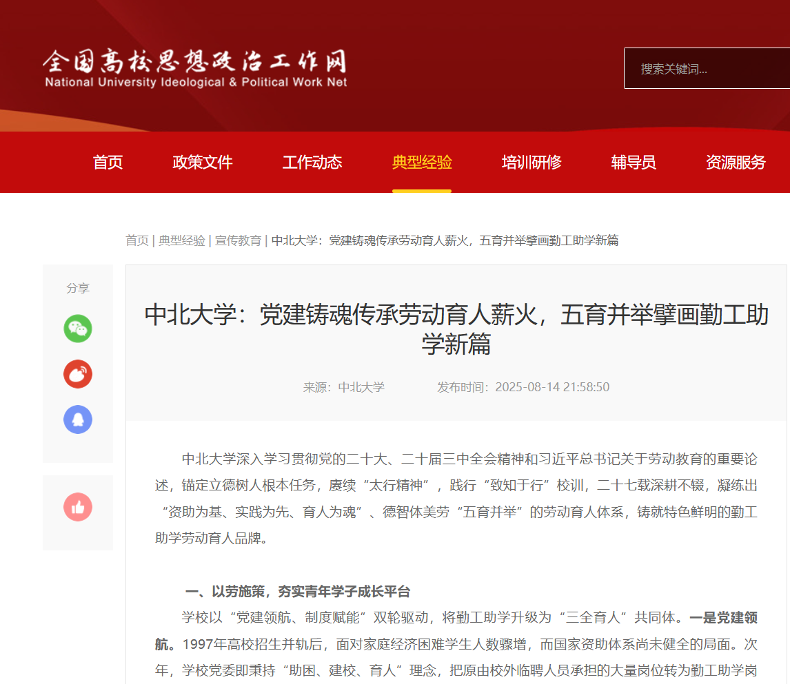 链接:中北大学:党建铸魂传承劳动育人薪火,五育并举擘画勤工助学新篇 - 宣传教育 - 全国高校思想政治工作网