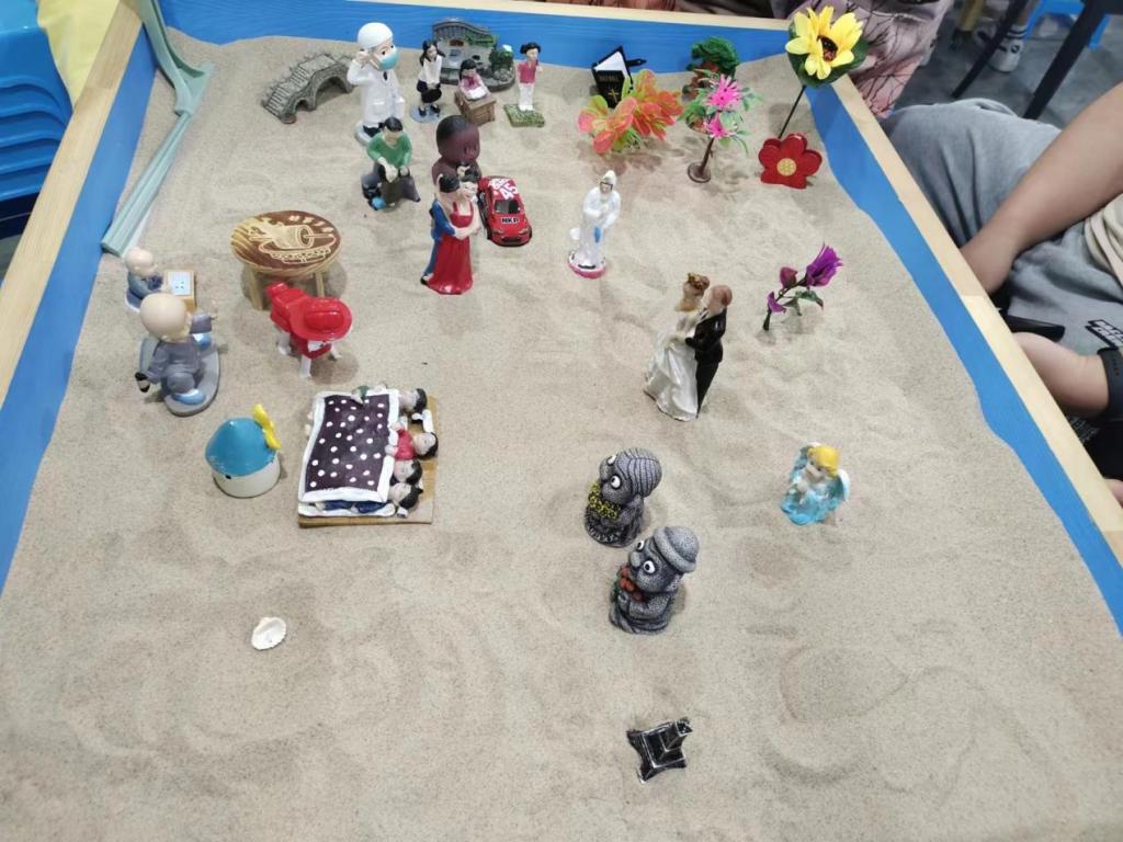 节日当天,同学们相聚在科艺苑心理中心,积极展示自己精心设计的沙盘。这些沙盘重现了每个学生和与母亲相处的重要时刻。他们运用沙子和沙具,在沙盘上细致地构建了母亲陪伴孩子的温馨场景,如童年的欢笑、困难时期坚定的支持等。