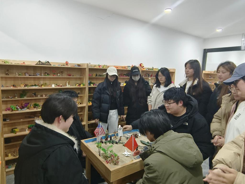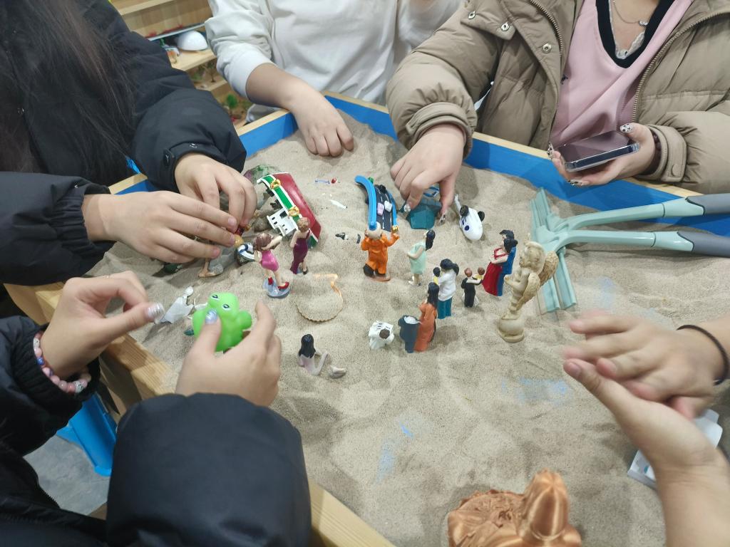 随后,培训进入到充满趣味与挑战的“团体沙盘游戏” 环节。赵老师耐心讲解了团体沙盘游戏的完整流程,强调了通过游戏提升团队协作能力的重要性。接着,赵老师介绍了各类沙具以及沙子的使用规则,并引导同学们自由组队,开启沙盘作品的创作之旅。在创作过程中,同学们充分发挥想象力与逻辑思维能力,精心构思与摆放沙具,构建出一个个独具特色的沙盘世界。沙盘摆放完成后,赵老师与同学们一同深入探索这些微观世界,通过每位同学讲述自己的故事,深入解析沙具选择与摆放位置背后所蕴含的心理状态与意义,使同学们对自身内心世界有了更为清晰的认知与理解。最后,同学们纷纷踊跃分享自己在此次培训中的体验与感悟,现场气氛热烈而融洽。