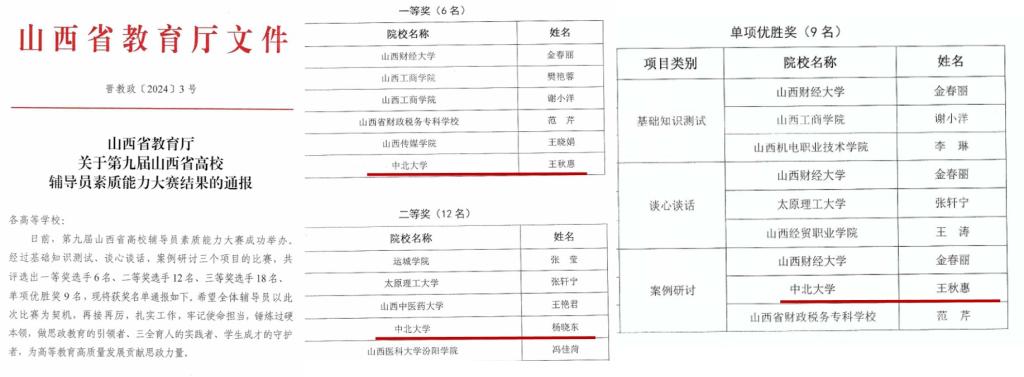 5月25日,由山西省教育厅主办的“第九届山西省高校辅导员素质能力大赛”在太原理工大学明向校区圆满落下帷幕。经过激烈角逐,我校信息与通信工程学院辅导员王秋惠和计算机科学与技术学院辅导员杨晓东分别获得一等奖和二等奖的好成绩,王秋惠在案例研讨环节获得单项优胜奖。