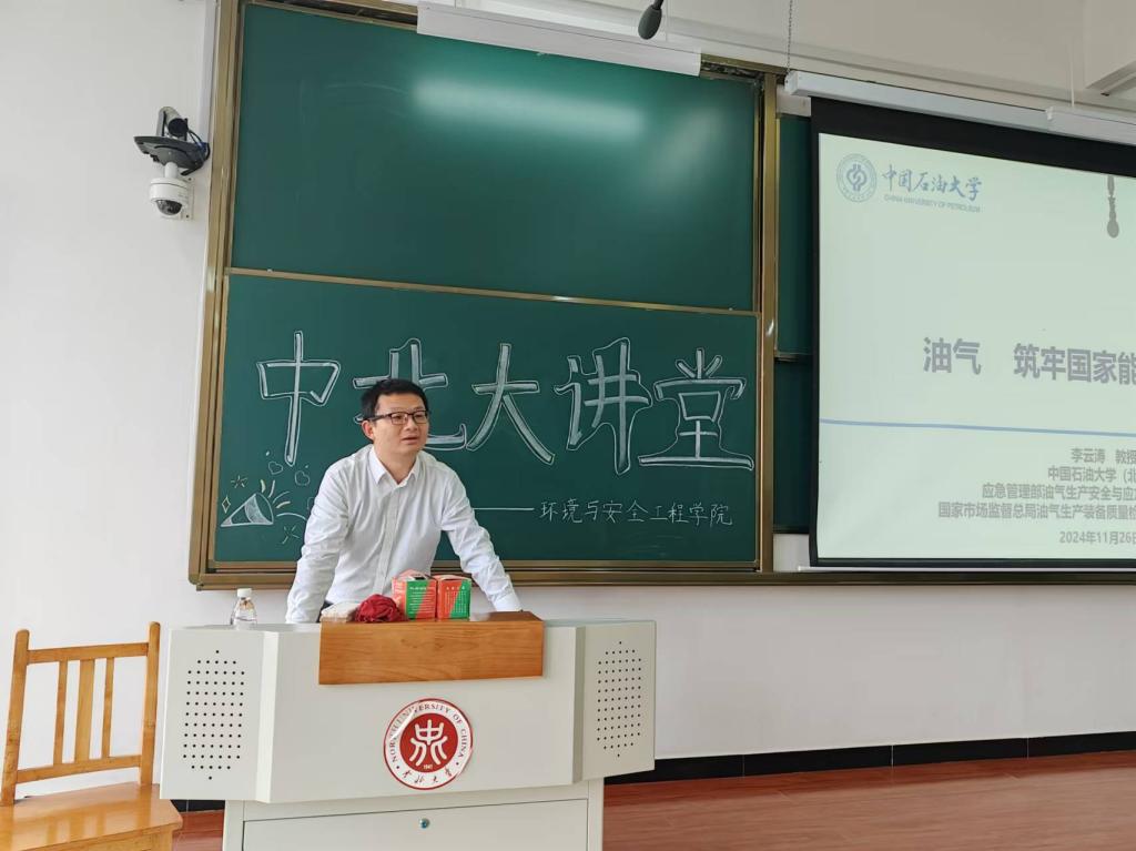 2024年11月26日下午,由中北大学学生工作部主办,环境与安全工程学院、艺术学院承办的“中北大讲堂”在17205H教室顺利举办。中国石油大学李云涛教授以“油气,筑牢国家能源安全之基”为题,为学生带来了一场精彩纷呈的能源安全讲座。