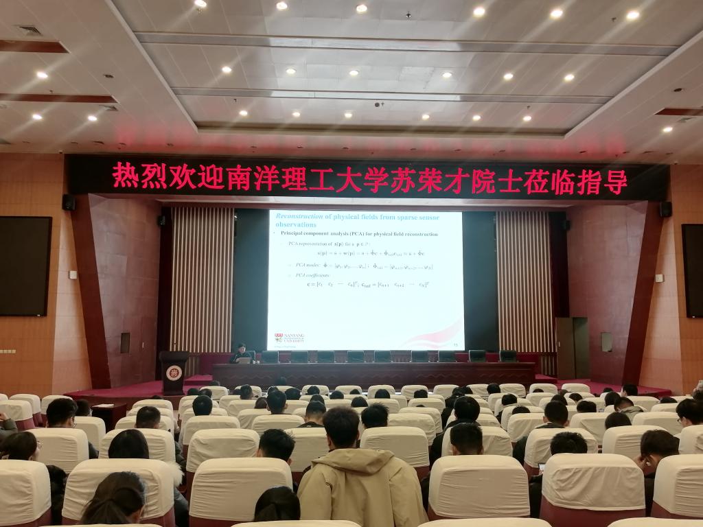 报告会上,苏荣才院士围绕如何高效利用稀疏传感器观测数据与计算流体动力学(CFD)仿真融合、快速重建复杂物理场展开,内容涵盖物理场的主成分分析(PCA)、回归建模及基于特征值的贪婪算法优化传感器布置,并结合实际案例与仿真数据,展示了该技术在智能系统与节能工程中的应用潜力。报告会结束后,苏荣才院士和仪器与电子学院师生进行了传感器技术和算法方面的学术交流与探讨。